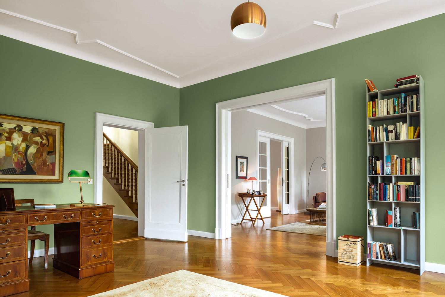 Im Arbeitszimmer bewirkt NO 83 QUEEN GREEN, ein sanftes Cannabisgrün, harmonisch ebenmäßige Oberflächen, passend zu den dunklen Holzmöbeln. Bilder und Rahmen werden schön zur Geltung gebracht. Auch hier entsteht eine unaufgeregte Stimmung – angenehm ergänzt durch die Wärme des Farbtons, der inspiriert ist von der in den USA legalen Marihuana-Sorte Queen Green, die besonders happy machen soll.