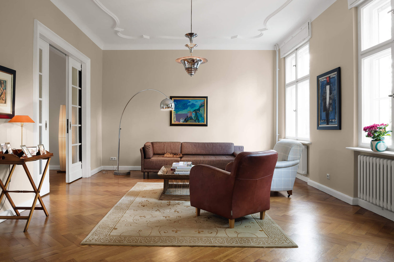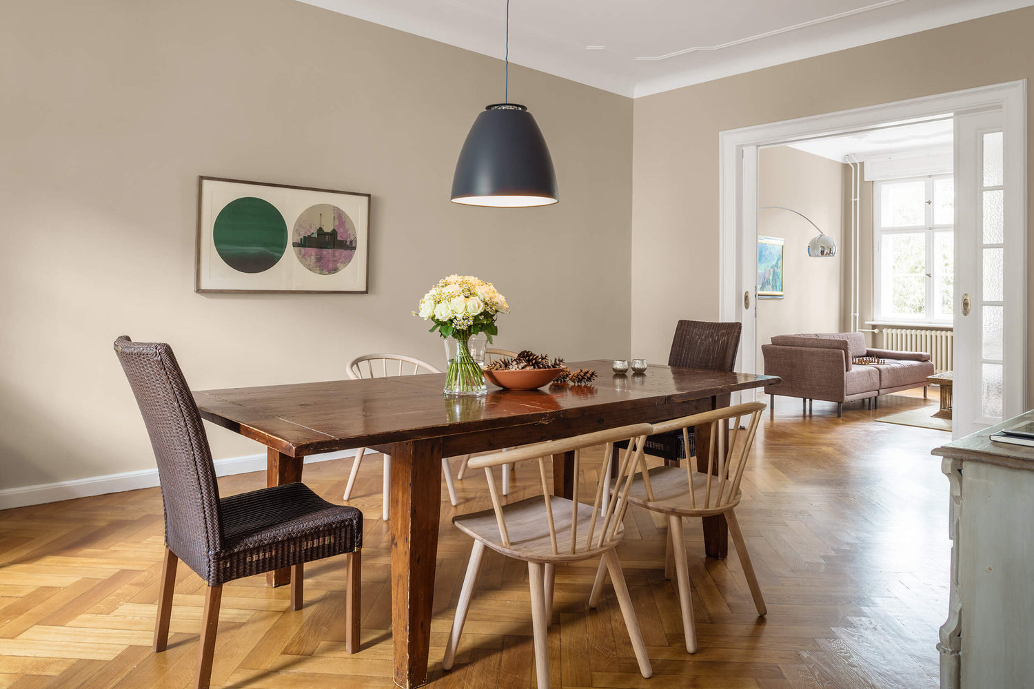 Im Wohn- und Esszimmer sorgt der Farbton NO 31 PILLBOX, ein charmantes Grau, für Eleganz und Ruhe. Der Pillbox-Hut, am elegantesten in pastelligen Grautönen, wurde auf den Häuptern der Stilikonen in den 60ern selbst zur Ikone. Bis heute ist er ein beliebtes Modezitat und Statement für zeitlose Eleganz. Der ausgesprochen edle Grauton kontrastiert ausdrucksstark mit den weißen Tür- und Fensterrahmen und dem braunen Parkettboden.