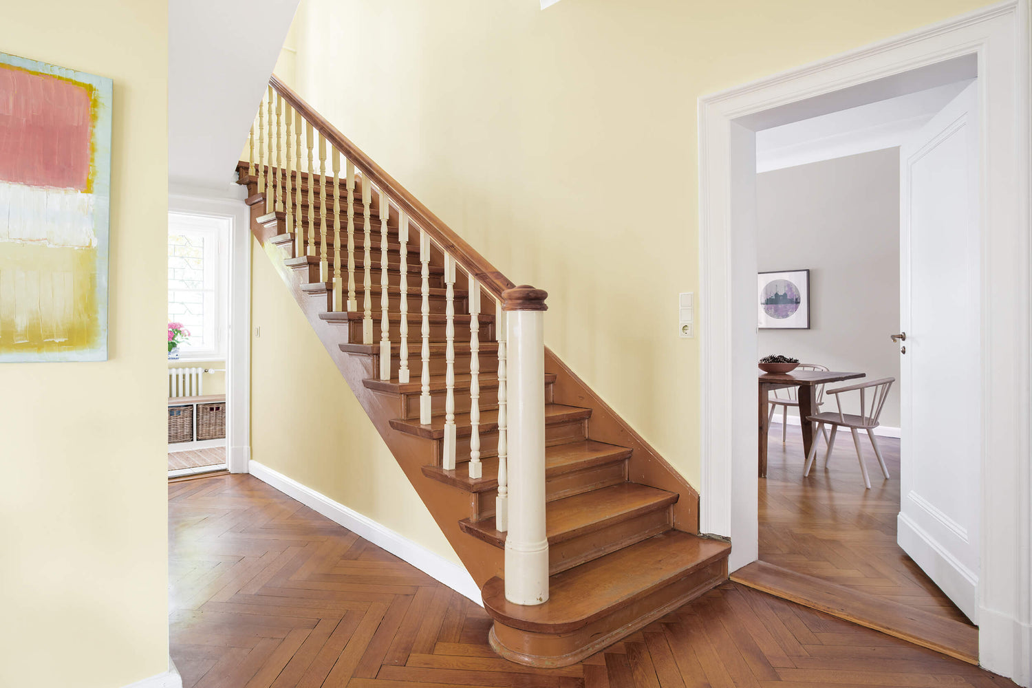 NO 91 POPCORN ist im Flur ein fröhlicher Willkommensgruß. Das zarte Vanillegelb lässt den Flur in Verbindung mit dem Holzboden leicht und offen erscheinen und versprüht eine belebte, positive Atmosphäre. Apropos – diese Farbikone ist eine Hommage an die Traumfabrik Hollywood und den Kultsnack jedes Kinobesuchs!