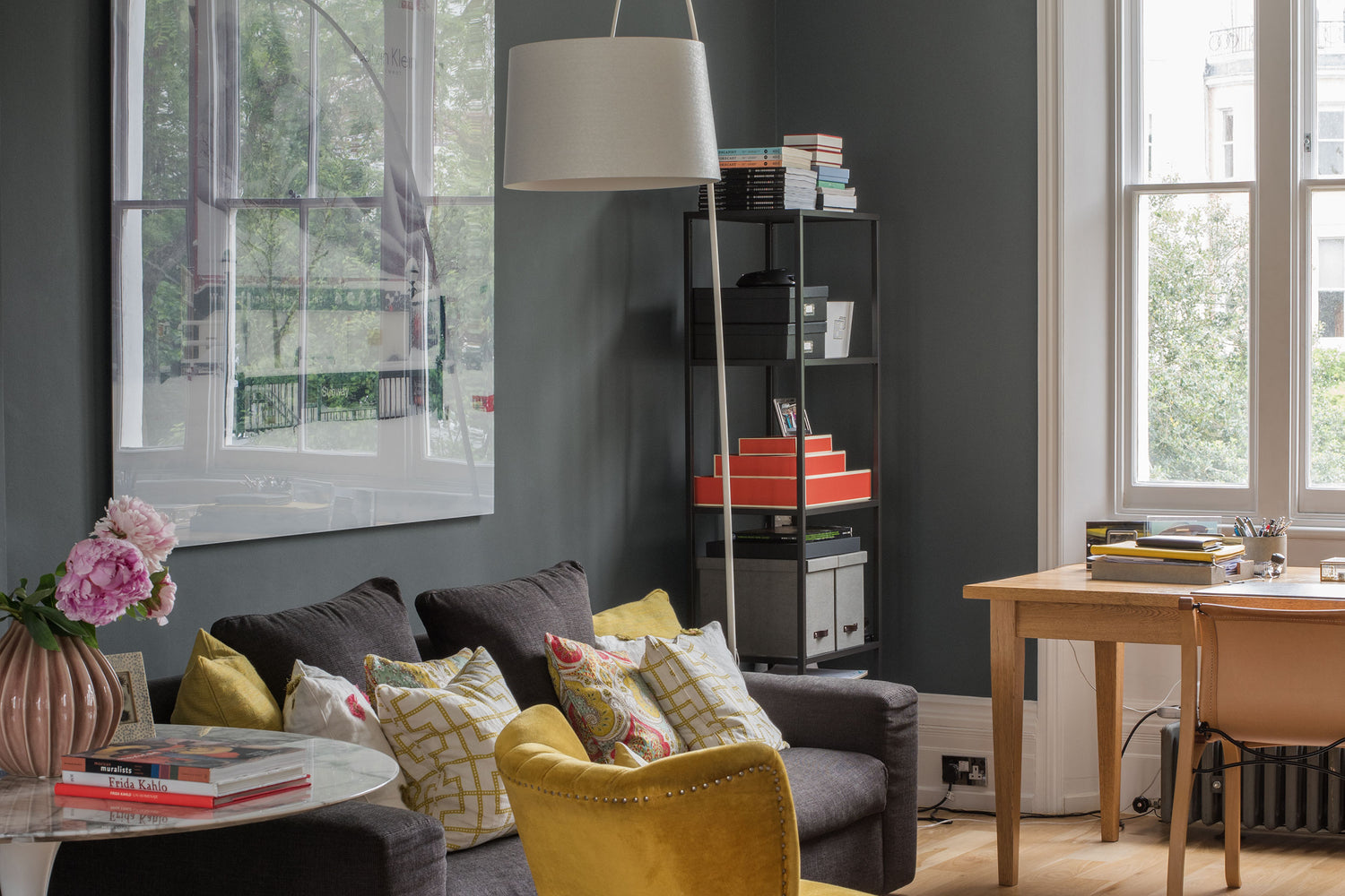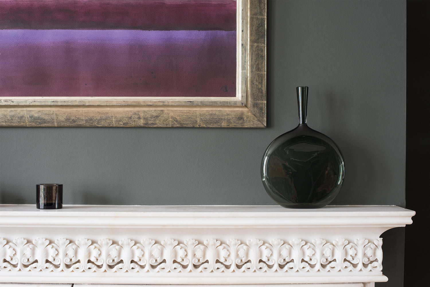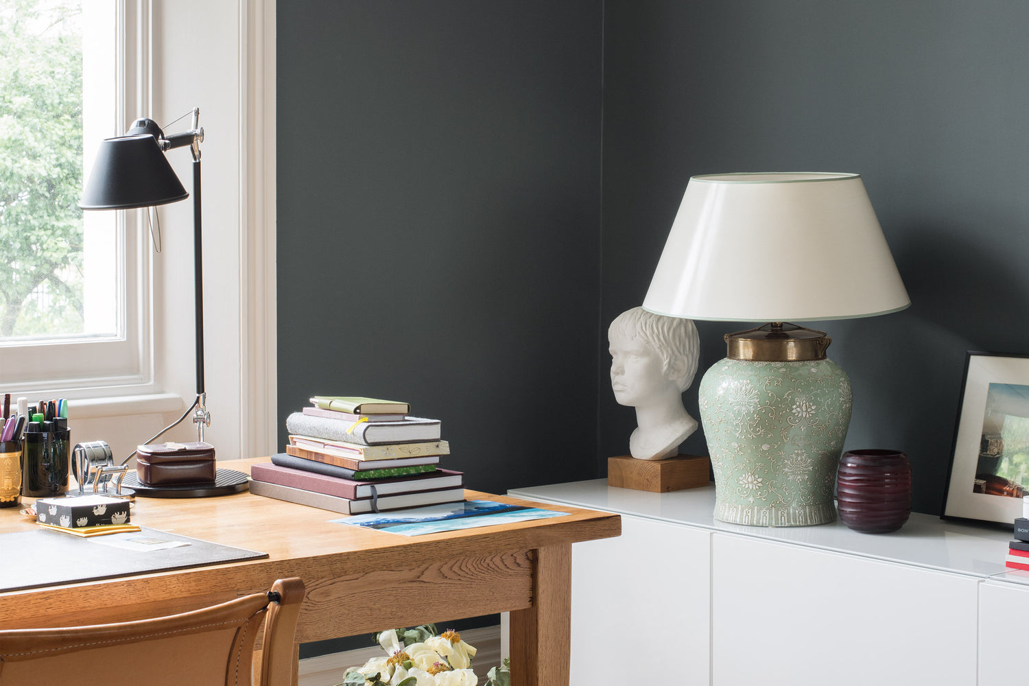 Ein Spiel von hell und dunkel: Eine hohe Farbtiefe zeichnet den Grau-Grün-Ton von NO 70 TRIPPY aus und setzt ein intensives Statement im Raum. Die dunklen Wände lassen weiß noch stärker leuchten und harmonieren auf natürliche Weise mit verschiedenen Holztönen.