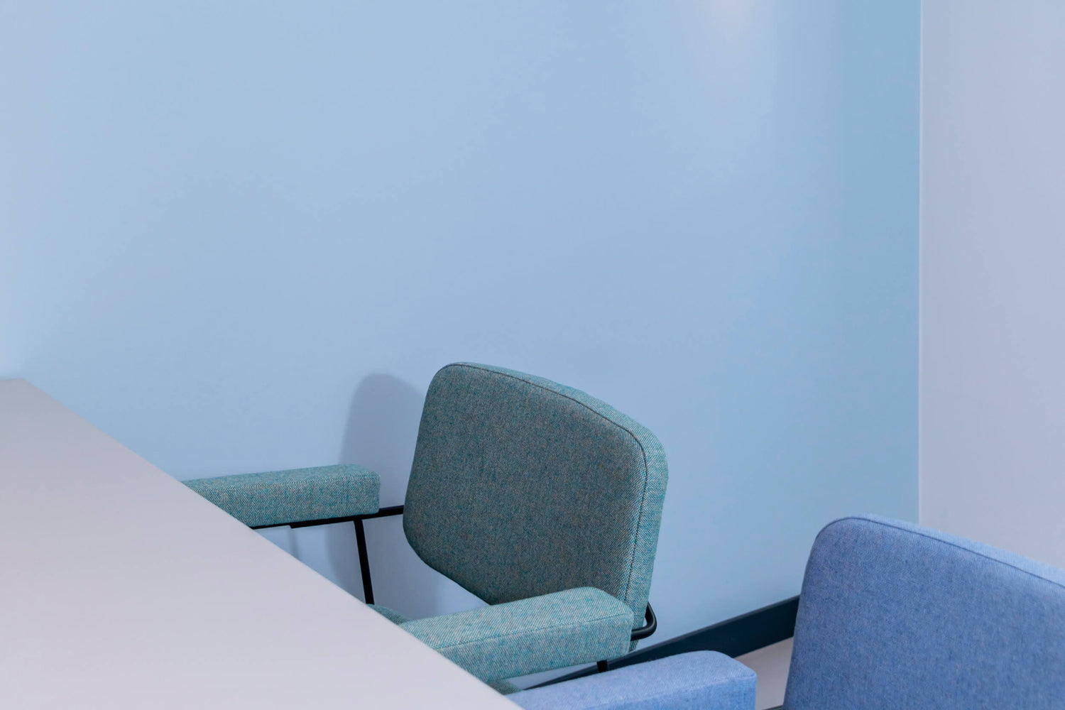 Das verhüllte Pistaziengrün NO 67 PIN-UP hingegen entwickelt an den Wänden des Meetingbereichs einen interessanten Vintage-Flair.