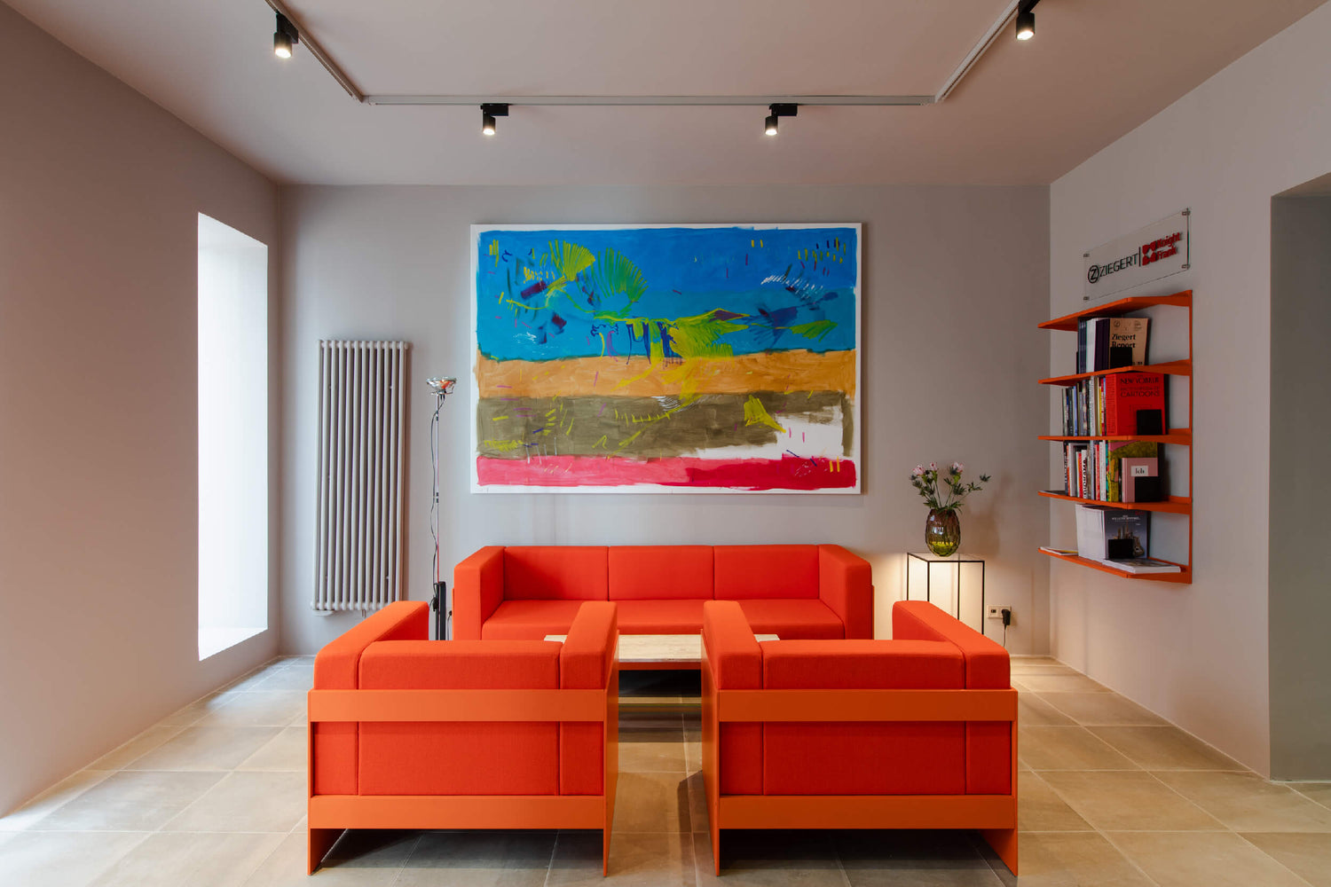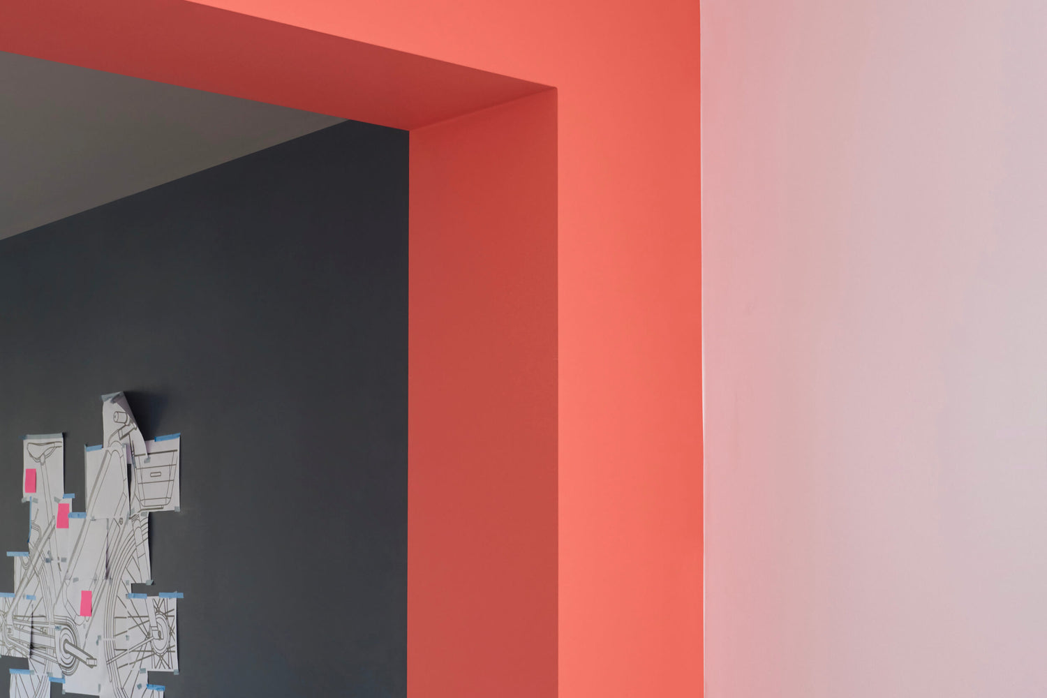 Im repräsentativen Eingangsbereich sowie im Meetingbereich sind die deutlichsten Farbakzente zu erkennen: Das urbane Lichtgrau NO 22 BOOMBOX schafft an der Decke des Empfangs einen Look des Industrial Chic, während der Petrol-Ton NO 65 SKATER dem Raum faszinierende Tiefe und Ausdruck verleiht. Trendiger Hingucker ist der Sturz, der im fruchtigen Rotorange NO 112 HIPSTER gestaltet wurde und dem Raum eine individuelle Note verleiht.