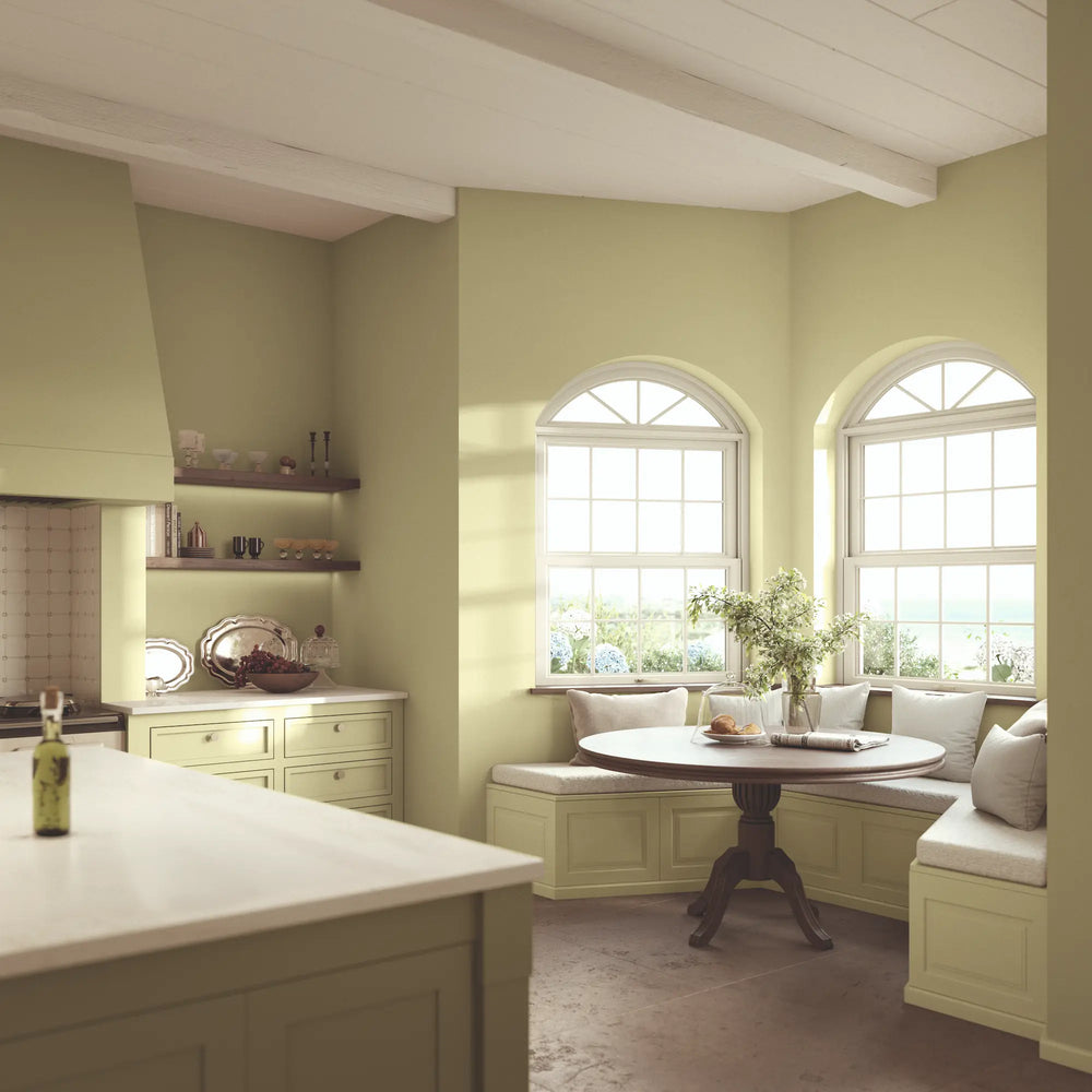 Die Farben einer Wildblumenwiese sind lebendig und freundlich. Verschiedene grüne Blätter, Gräser und Blüten strahlen Vitalität und Lebensfreude aus. Wie kein anderer Farbton steht Grün für Balance und Gesundheit – das gilt insbesondere für mittlere und hellere Nuancen. Ihr gezielter Einsatz an Wänden kann sich dieser Eigenschaften bedienen und Zimmer zum naturverbundenen, vitalisierenden Zuhause werden lassen. Steinböden und helle Möbel lassen sich harmonisch dazu kombinieren. Besonders kleine Zimmer, Flure und Räume mit wenig Licht können mit diesen sechs zarten Farbtönen aufgewertet werden.