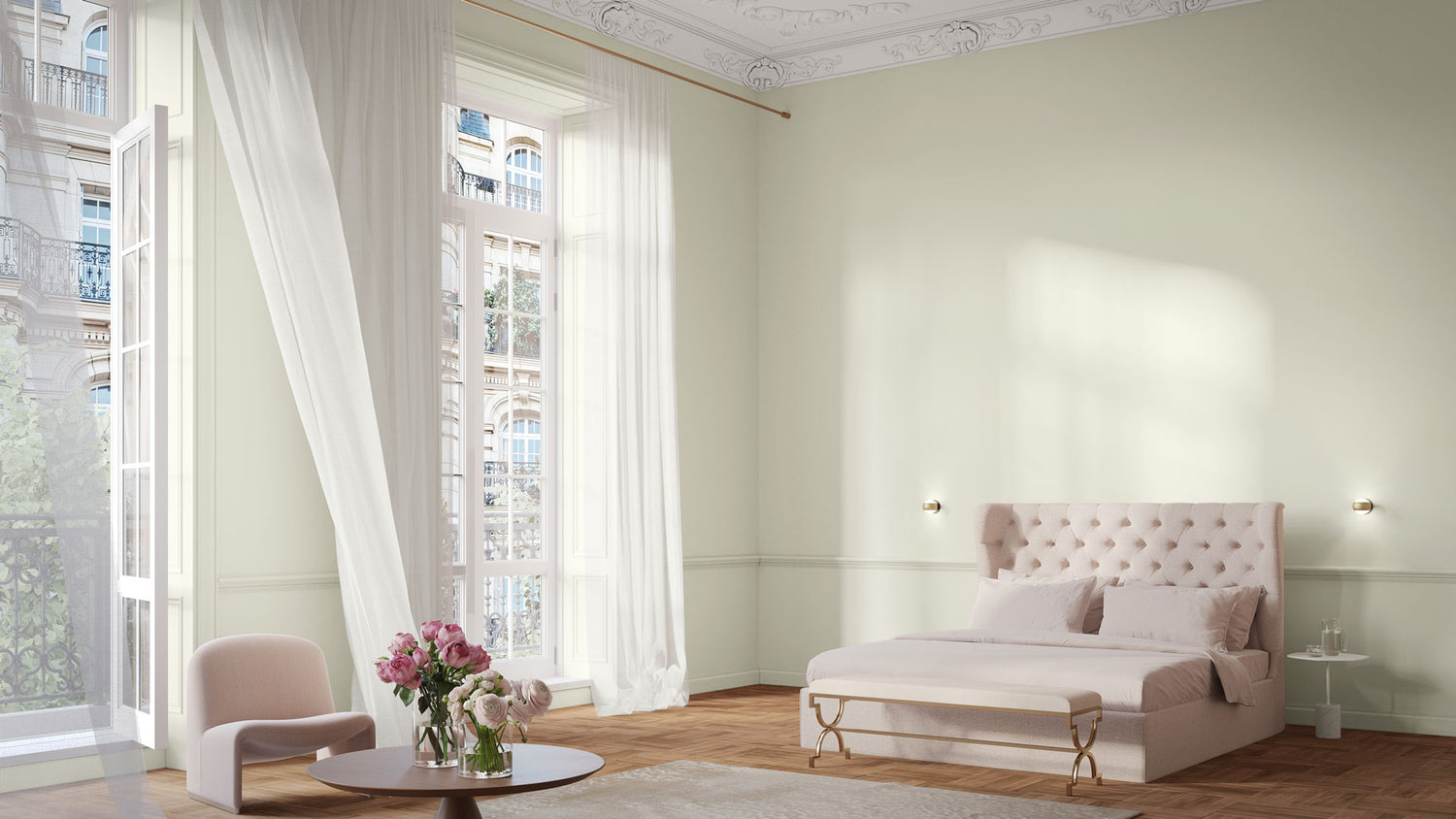 Pastelliges Maigrün. Würde man das feine Weiß von Maiglöckchen mit dem Grünton der Blätter mischen, so ergäbe sich diese duftige Weiß-Grün-Komposition. Die Farbe bringt Leichtigkeit und Frische in Wohnräume, da sie eine Verbindung zur Natur schafft.