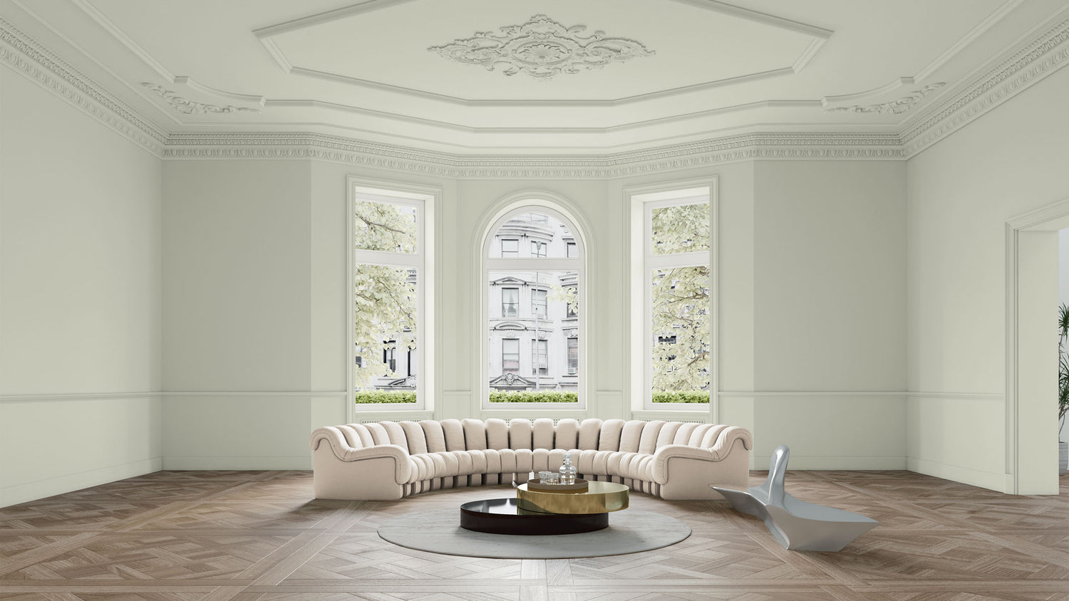 Grünbasiertes Altweiß, das die Helligkeit und Freundlichkeit eines Frühlingsmorgens ausstrahlt. Der Ton schafft ein positives Raumklima: Wellness für die Wände!